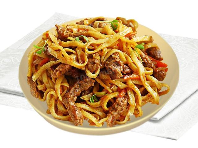 5. Как овощи и мясо приготовятся, перекладываем в сковороду лапшу, перемешивая готовим пару минут.