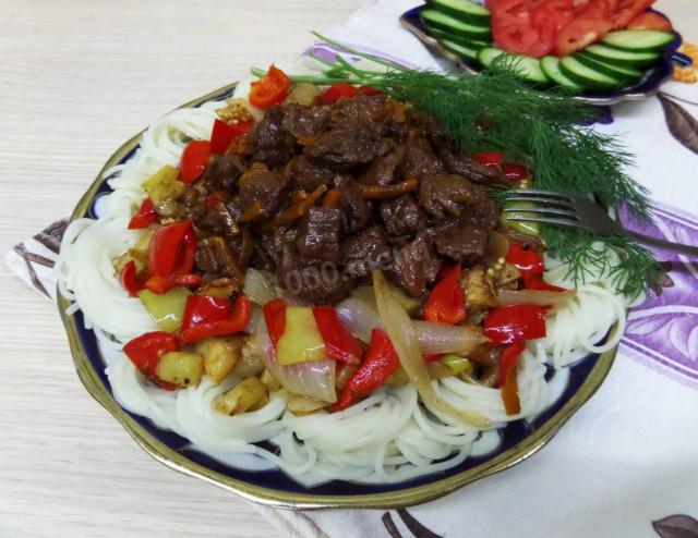 Готовую лапшу разложить на широкое блюдо. Поверху равномерно распределить поджаренные овощи и мясо. Для более пикантного вкуса можно слегка оросить столовым или яблочным уксусом. Также к блюду можно добавить острый молотый или стручковый горький перчик. Блюдо получилось просто пальчики оближешь! не стыдно подать гостям. Приятного всем аппетита!