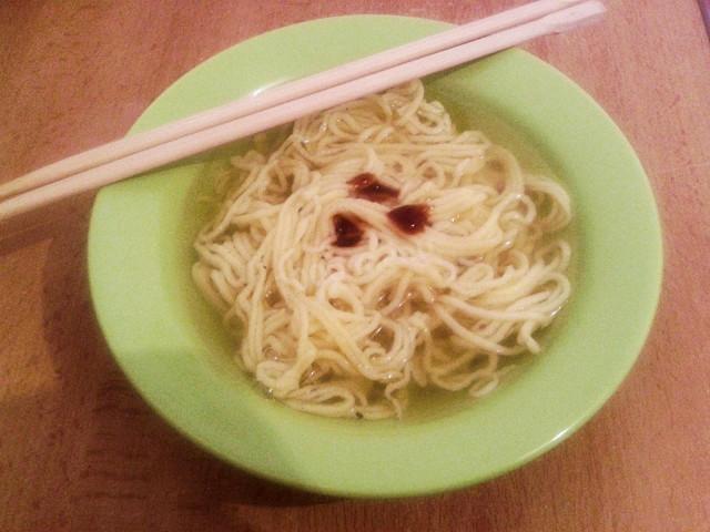 У пакета срезаем уголок, чтобы получилась дырочка примерно в 2 миллиметра и выдавливаем тесто в кипящий бульон. Лапша тут же схватывается и тонет. В первые секунды нити могут слипнуться, поэтому выдавливать надо по всей поверхности сковороды. Как только лапшинки всплыли, их нужно достать и выложить в тарелку, чтобы они не переварились.