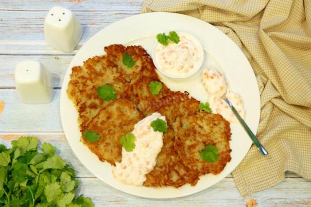 Готовые картофельные латкес подавайте горячими, просто выложите их на блюдо и полейте сметанно-икорным соусом. Это традиционное блюдо на еврейскую Хануку, но их можно есть и в любые другие дни)