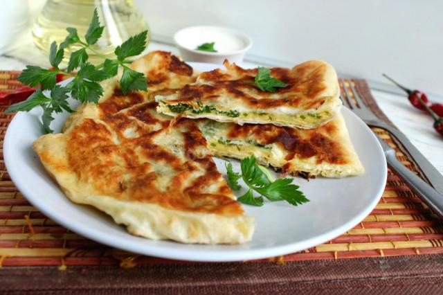 Жарим лаваш с начинкой с одной стороны около 2-3 минут на среднем огне, когда низ лепешки начнет покрываться румяной корочкой, переворачиваем его и продолжаем жарку с другой стороны до румяной корочки.