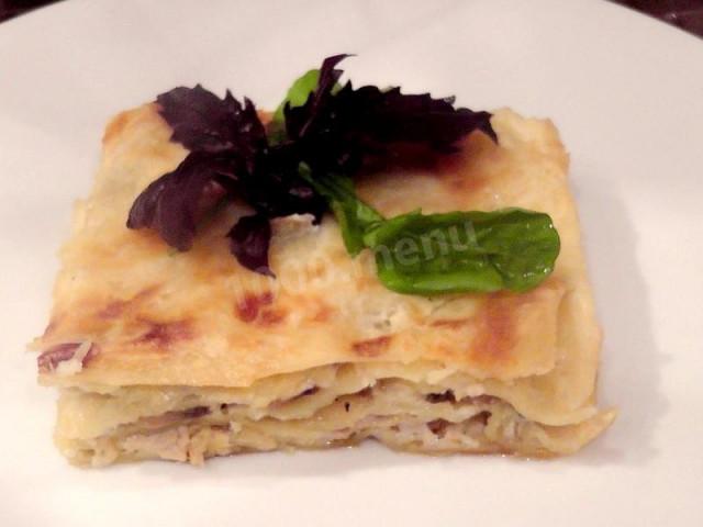 Затем кладем начинку из жареных грибов с курицей. Посыпаем все это тертым сыром и заливаем соус. Эту процедуру повторяем два раза. Разогреваем духовку до 200 градусов и ставим лазанью в разогретую духовку примерно на 40 минут. Лазанья с курицей и грибами готова! Приятного аппетита!