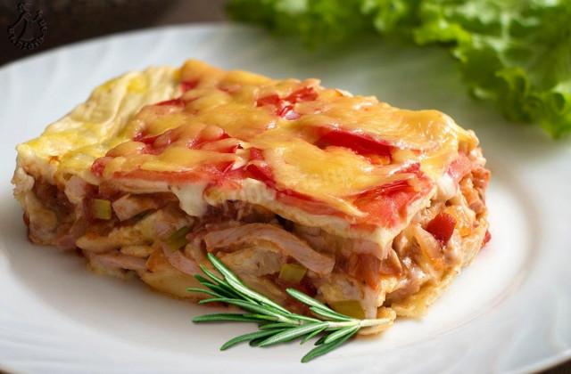 5. Отправляем форму в духовку предварительно разогретую до 180 градусов, запекаем в течение 25 минут, после чего достаем лазанью, выкладываем на поверхности кружочки помидоров, посыпаем оставшимся сыром, возвращаем в духовку на 10 минут.
