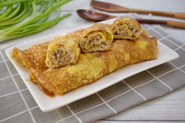Затем снимите блинчик на тарелку, выложите на него подготовленную мясную начинку и распределите по всей поверхности. Скрутите блинчик с начинкой в рулет.