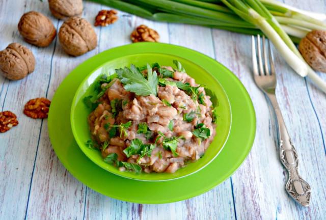 Теперь добавляем в лобио тушеный лук, измельченные грецкие орехи, специи, и перемешиваем.