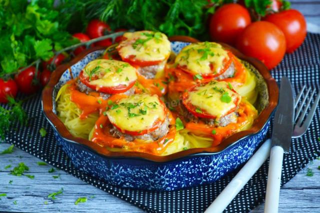 Поверх фарша разложите кружочки помидоров и посыпьте сверху тертым сыром.