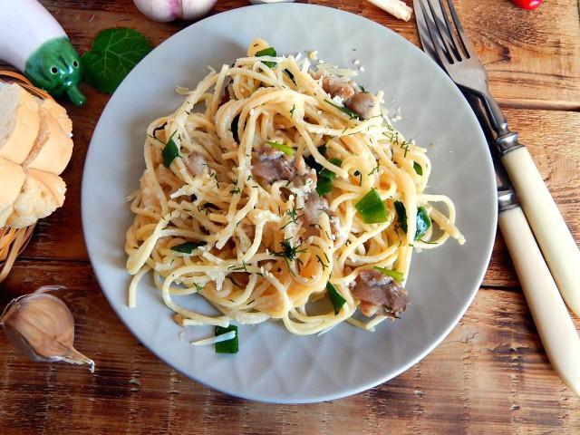 В сковороду с индейкой кладем макароны, измельченный чеснок. Перемешиваем. Жарим их вместе около 5 минут. Выключаем огонь. Оставляем блюдо под крышкой еще на 10 минут.