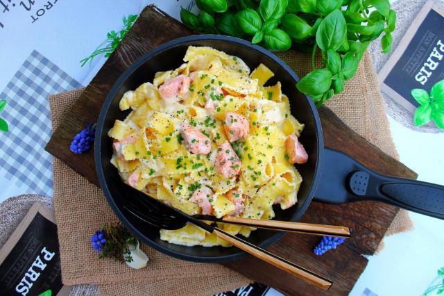 Добавьте в сковородку со сливочным соусом макароны и кусочки красной рыбы. Аккуратно всё перемешайте.