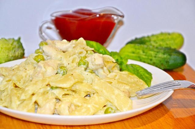 Простое, вкусное и сытное блюдо для всей семьи. Если у вас нет желания долго стоять у плиты, а нужно быстро и сытно накормить семью - такие макароны с курицей и горошком просто находка! Блюдо получается нежное, готовится из самых обычных продуктов. И что не мало важно - быстро! Приступим к готовке семейного обеда?