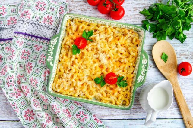 Поставьте макароны в заранее разогретую до 180С духовку на 15 минут. Время приготовления определяйте, ориентируясь на особенности работы духовки. Если сыр сверху хорошо расплавился и появилась корочка, значит можно вынимать форму из духовки.