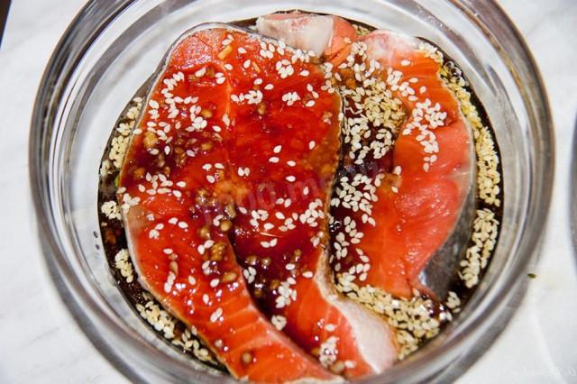 Неповторимо вкусная рыба готовится просто! Красная рыба - это нечто! Попробуйте замариновать ее перед приготовлением и вы прочувствуете всю разницу лично. Маринад по данному рецепту сделает рыбу более мягкой, нежной и ароматной.