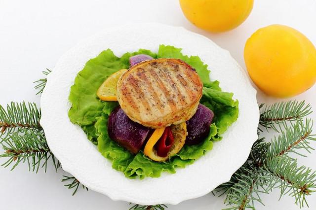 8. Готовые медальоны (не забудьте снять нитки) выложите на подушку из листьев салата и запеченных овощей и апельсина.