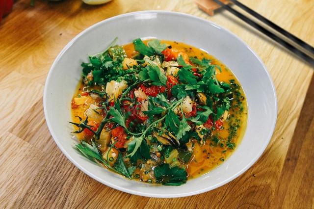 Большую сковороду ставим на средний огонь, хорошо разогреваем в ней оливковое масло (50 мл). Выкладываем в сковороду лук и чеснок, обжариваем, помешивая, до полупрозрачности. По времени это займет примерно 2 минуты. Теперь добавляем в сковороду перец чили, сельдерей, цукини и фенхель, перемешиваем, после чего приправляем солью и перцем и снова мешаем. Готовим все вместе до мягкости (около 2 минут).