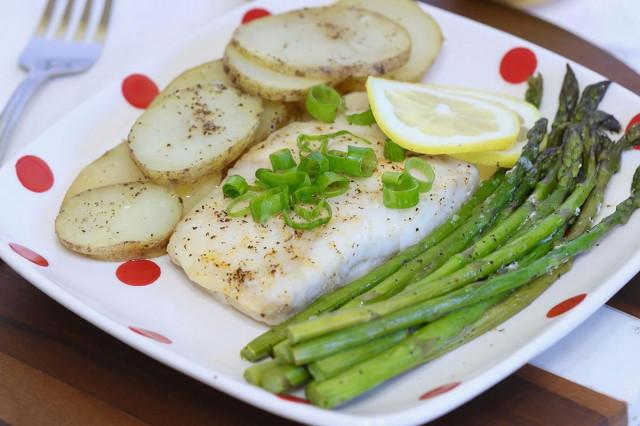5. Приготовить 6 листов фольги для запекания. На лист фольги выложить слой нарезанного картофеля и спаржу. Посолить и приправить овощи молотым черным перцем. Затем сбрызнуть овощи оливковым маслом. Сверху на овощи выложить филе минтая. Также приправить его солью, перцем и специями для рыбы (можно купить готовые в магазине). Рыбное филе также сбрызнуть оливковым маслом и полить лимонным соком.