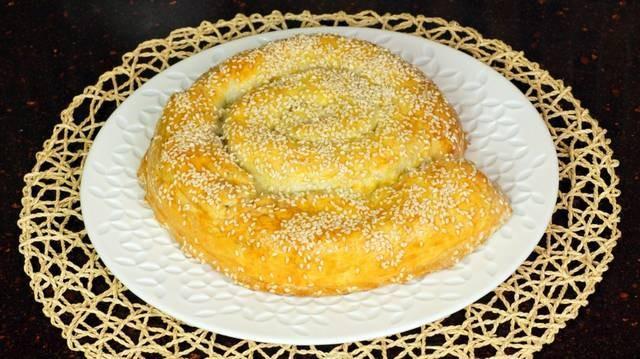 Подготавливаю противень. Сбрызгиваю водой противень, чтоб не скользил пергамент. Выкладываю пергаментную бумагу для выпечки и чуть присыпаю мукой. Помещаю колбаску из теста на противень и от центра закручиваю в форме улитки.Взбиваю желток и равномерно прохожусь силиконовой кистью по верхушки и бокам пирога. Это даст мне красивый цвет при выпечки. Посыпаю обильно кунжутом.