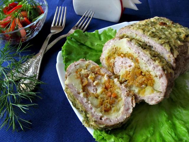 Мясное и гарнир одновременно. Очень удобно и вкусно! Мясной рулет с овощами - очень удобное блюдо, сочетающее в себе и мясо и гарнир. Рецепт требует предварительной подготовки начинки, но процесс приготовления совсем несложный. Запеченный в фольге, рулет получается сочный, с пикантным вкусом специй. Он отлично подойдет в качестве второго блюда. Подавать мясной рулет горячим с салатом из свежих овощей и зелени.