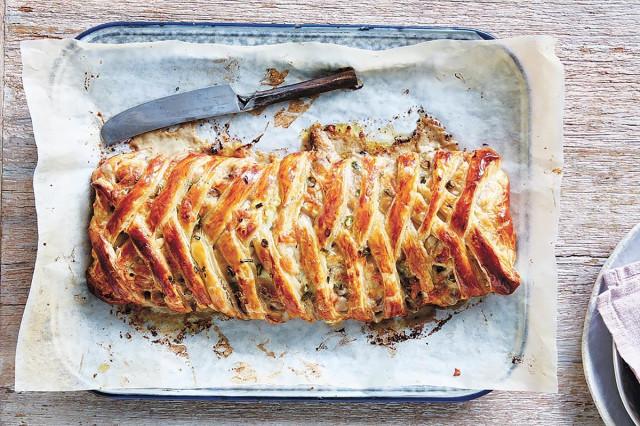 4. На рабочей поверхности расстилаем пергамент для выпечки, на него помещаем оба листа теста, немного их раскатываем.Тесто, конечно, должно быть разморожено, поэтому достаем его заранее из морозилки. Взбиваем куриное яйцо в стаканчике при помощи вилки и кулинарной кистью смазываем край одного из листов теста (хватит шириной в 1 см). Накладываем поверх смазанного края край второго листа, немного прижимаем, чтобы соединить пласты теста в один большой. Далее нужно нанести на тесто разметку, чтобы сплести красивую косу, но это делать необязательно - можно просто завернуть тесто с начинкой в классический рулет.