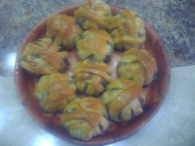 6. Из фарша формируем колобок и обматываем тестом как клубок.