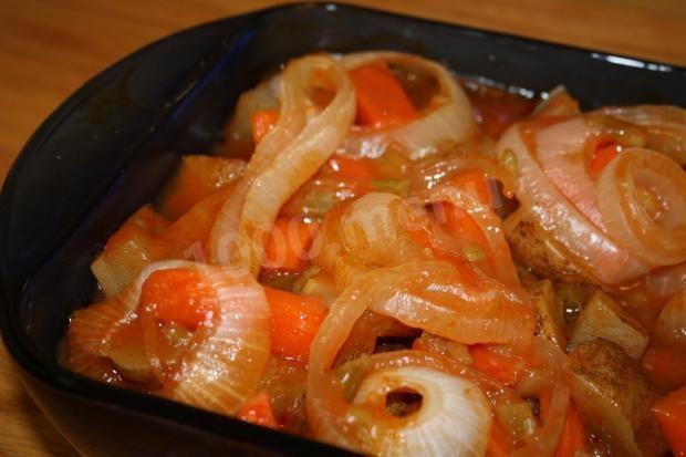 При подаче на стол, мясо нарезаем и подаем его с картофелем и свежей морковью.