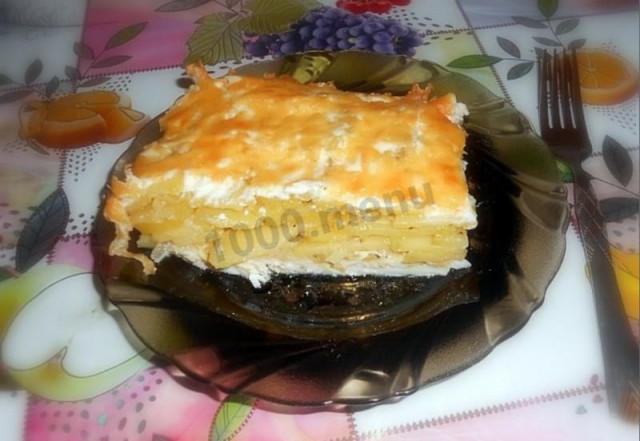 Картофель уложить в нашу форму на лук в три слоя (как для моей формы))), при этом каждый слой посолить и поперчить.