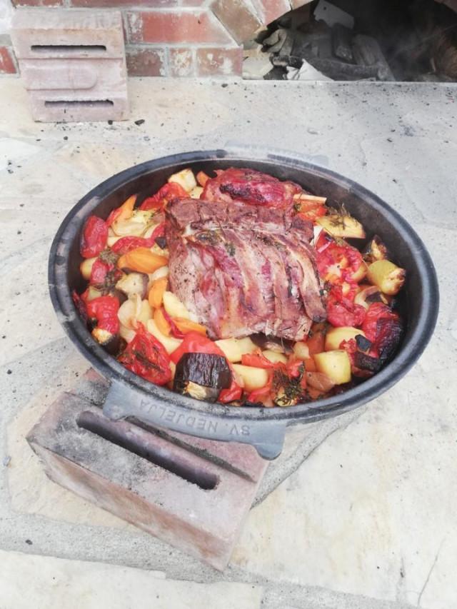 Мы печь закрывали, но я, думаю, это не обязательно, так как я видела в интернете, как это блюдо готовили в костре. Через час хорошо смести крышку, поднять её, влить сухое белое вино, снова закрыть, обсыпать углями и готовить до готовности. Обязательно следите за углями, чтобы было достаточно жару.