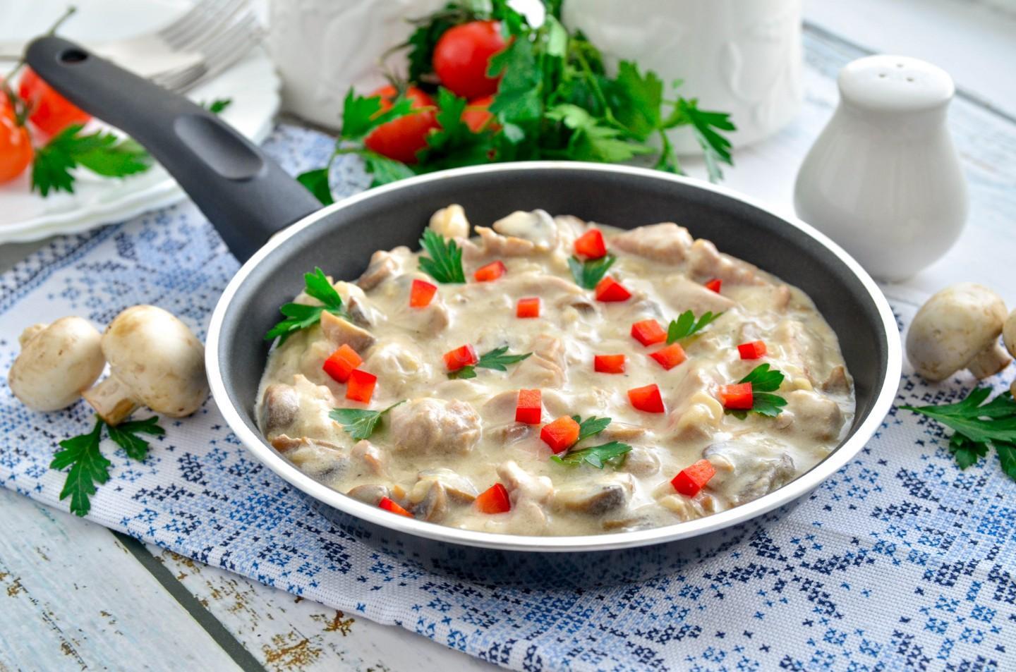 Мясо с грибами в сметанном соусе на сковороде