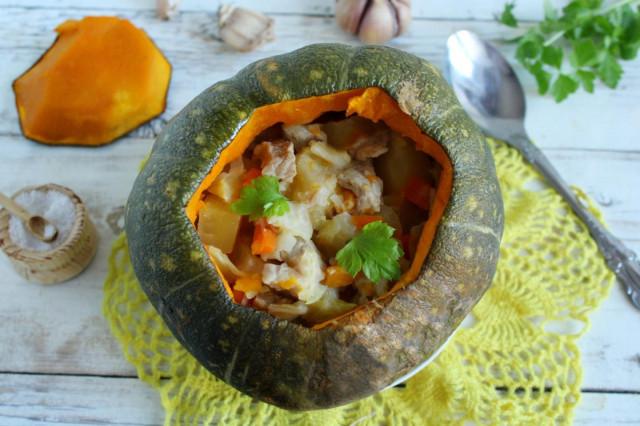 Вкусное, сытное, полезное, интересное в подаче блюдо! Мясо с картошкой - универсальное сочетание (углеводы и жиры), получается сытно и питательно. А вот запекание этих ингредиентов в тыкве делает блюдо менее калорийным, более полезным и оригинальным в подаче.