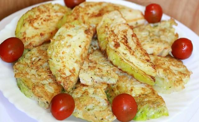 5. На сковороду нальем масла растительного и подогреем. Кусочки капусты опустим в яично-пряную смесь и выложим на сковородку.