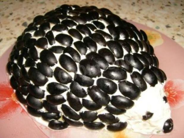Пару месяцев назад у моей маленькой двоюродной сестрички был день рождения. Я как маститый кулинар вызвалась помочь её маме в приготовлении праздничного детского стола. Конечно, детский стол разительно отличается от привычного взрослого тем, что помимо того, что блюда должны быть вкусными, так они ещё должны быть привлекательны для детей. Вот почему я решила приготовить любимую мною еду - салат ёжик. Именно кулинарным рецептом этой закуски я сейчас с вами и поделюсь. Итак, начинаем с того, что моем грибы и мелко их нарезаем. Обжариваем шампиньоны на масле в сковороде. Мелко нарезаем зелень. Нарезаем оливки колечками, маслины разрезаем на 4 части. Теперь мелко режем лук и ошпариваем кипятком, чтобы он потерял излишнюю горечь. Теперь пришло время уложить салат. В форме ёжика (своеобразной капли) слоями выкладываем поочерёдно ингредиенты, в следующей последовательности: картофель, потёртый на средней тёрке, лук, зелень, затем промазываем всё майонезом. Далее укладываем желток, перетёртый на тёрке, мелко порезанные солёные огурцы и снова промазываем майонезом. Теперь укладываем грибы, снова промазываем майонезом, оливки, белок, перетёртый на тёрке, снова хорошенько промазываем майонезом. Теперь наступает самый творческий момент: необходимо маслинами выложить на всей поверхности туловища ёжика колючки, а также на мордочке глаза и нос. Вот наш необычный салат с жареными шампиньонами Ежик и готов!!! Уверена, вашим детям очень понравится этот салатик!