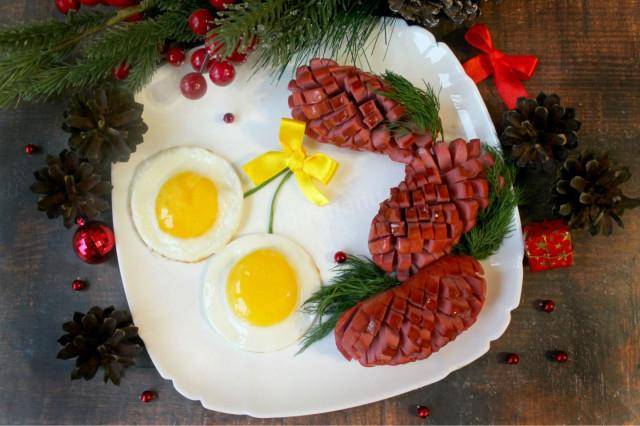 Аккуратно снимите кондитерское кольцо, а приготовленную глазунью с помощью лопатки переложите на тарелку. Приготовьте таким же образом вторую глазунью и также выложите ее на тарелку. Рядом выложите шишки из сарделек и украсьте блюдо свежим укропом. Подайте новогодний завтрак к столу с хлебом и чашечкой вкусного капучино.