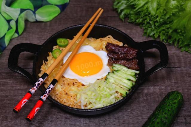 Пряный, острый, манящий аромат, пробуждающий аппетит! Этот рецепт лапши интересен тем, что он приготовлен из купленного в магазине пакета с лапшой быстрого приготовления, но «одомашнен» путем добавления в блюдо дополнительных ингредиентов, придающих этому блюду совершенно новый вкус.