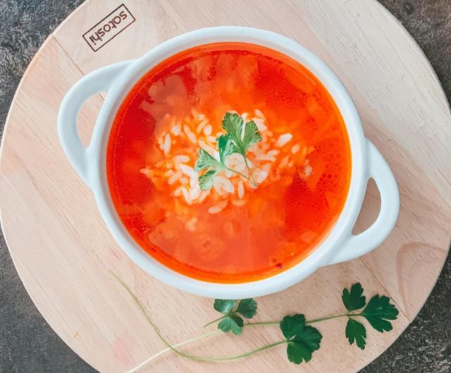 Готовую зажарку добавьте в заготовку супа. Отставьте в сторону для того, чтобы суп настоялся. Отварите рис. Добавляйте промытый рис порционно в суп. Подавайте готовый суп с зеленью и сметаной.