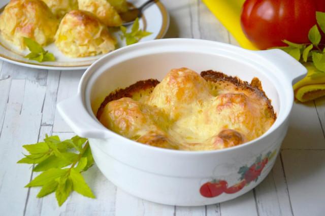 Картофель выложить срезом вниз в смазанную маслом форму для запекания. Сверху распределить сырную массу. Запекать картофель в разогретой до 180°С духовке в течение 15–20 минут до образования золотистой корочки.