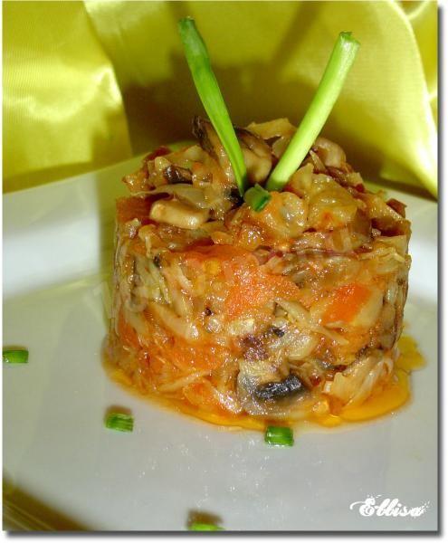 Шинкуем капусту, режем кабачок, грибы и лук с помидорами на кубики.
