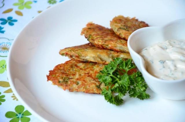 Картофель, топинамбур, кабачок и лук натираем на средней терке. Что бы сэкономить время, я натираю с помощью комбайна.