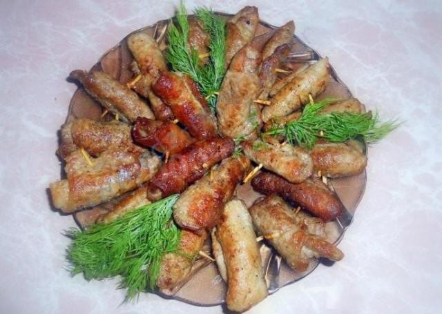 3. Режем сало тонкими не сильно длинными полосками и кладем на отбитый кусочек мяса и сворачиваем его рулетом ,закрепляем зубочисткой чтобы он не распался.