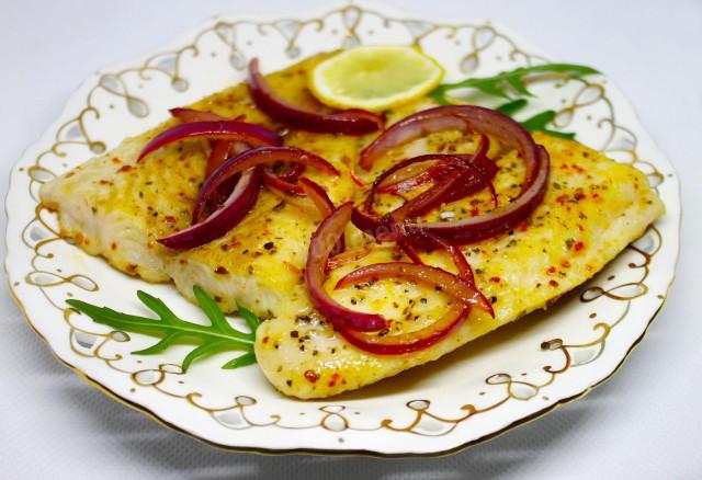 Филе разрежьте на 2 части. Посыпьте каждый кусочек солью, молотыми перцами и чесночным порошком. Переверните кусочки и проделайте то же самое с другой стороны. Оставьте рыбу буквально на пять минут мариноваться, этого будет вполне достаточно. А в это время лук очистите от шелухи и ополосните. Я обычно использую для рецепта красный лук или шалот, они очень красиво и аппетитно смотрятся в готовом блюде.