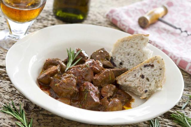 Теперь добавляем порезанную на кусочки печень, готовим ее в течение 5 минут, периодически перемешивая. После насыпаем муку, добавляем копченую паприку, мешаем и обжариваем все вместе еще 1 минуту. Наливаем белое вино и бульон, кладем томатную пасту и нарезанный розмарин, готовим еще 2 минуты, доводим жидкость до кипения.