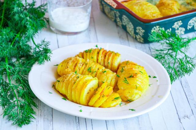 Оригинальный, аппетитный, вкуснейший гарнир на праздник! Печеный картофель в духовке — блюдо, которое очень эффектно выглядит благодаря предварительной нарезке каждого клубня. В конце картофель посыпается сухарями, за счет чего он получается румяным и хрустящим.
