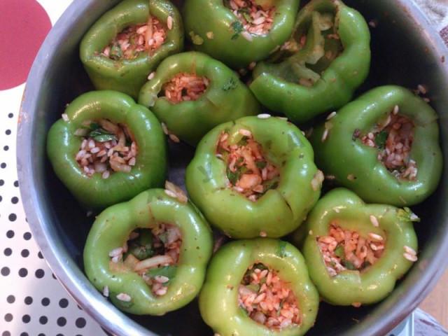 Промыть рис и оставить его набухать в воде, пока подготавливаете остальные ингредиенты. Промыть перцы и вынять из них хвостики. Для начинки подойдет большая луковица (или две небольшие), мелко порезать ее, добавить петрушку и мяту (если нет свежей мяты, подойдет сушеная), томатную пасту, специи, оливковое масло. Нафаршировать начинкой перцы, выложить их в кастрюлю, залить водой и варить на маленьком огне до готовности.