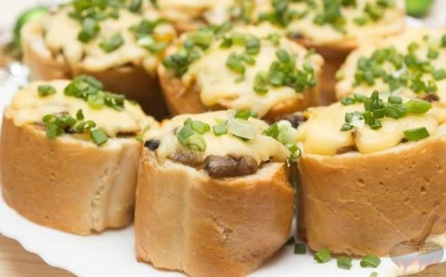 Багет нарезать поперек небольшими кусочками, толщиной примерно 2 см. Аккуратно примять мякиш в середине.