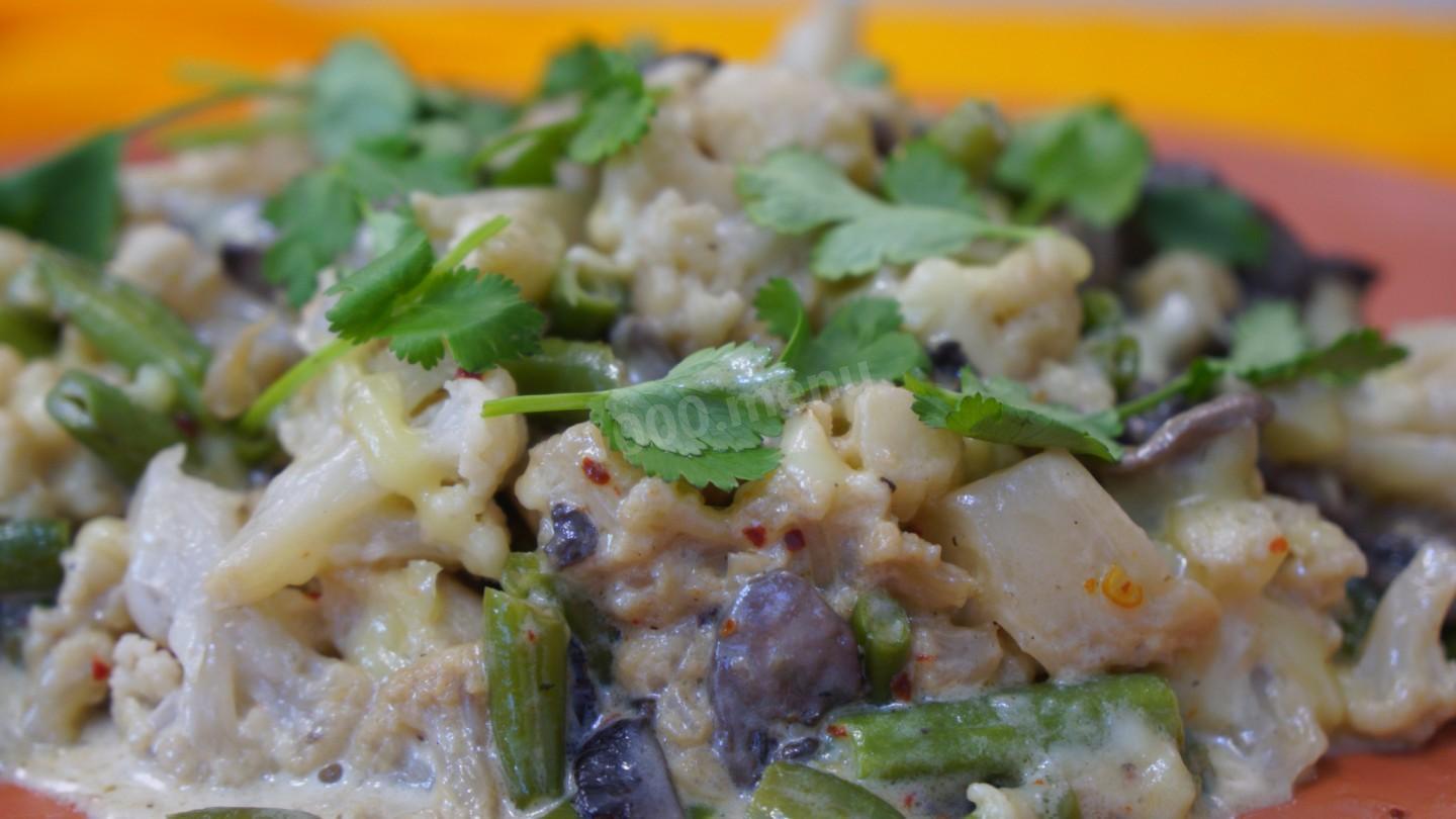 200 гр. стручковой фасоли, немного оливковое масла, 100 гр. грибов (шампиньоны), одна веточка кинзы, 50 гр. сыра твердых сортов, 36% - 40% сливки - 150 гр., 200 гр. цветной капусты, соевый соус по вкусу, морская соль по вкусу и острый перец чили по вкусу.