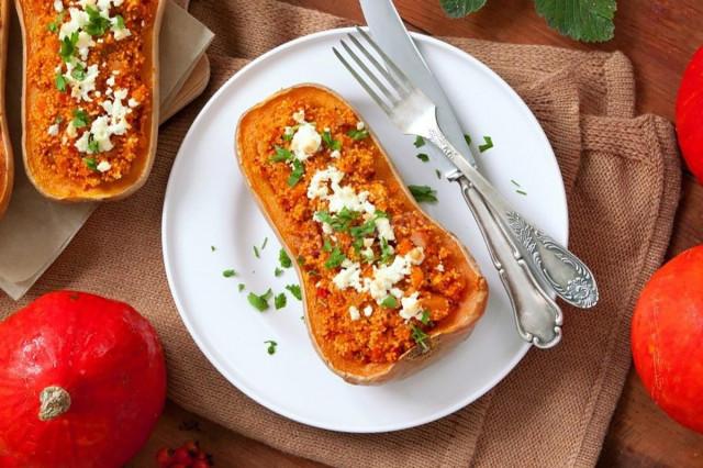 7. Запеченные тыквы вынуть из духовки и ложкой удалить всю сердцевину из половинок. Оставить только 1-2 см мякоти возле кожуры, чтобы тыква хорошо держала свою форму. В середину плодов положить смесь из каши, овощей и феты, и равномерно распределить ее по всей поверхности внутри тыквы. Сверху посыпать еще немного феты для украшения.