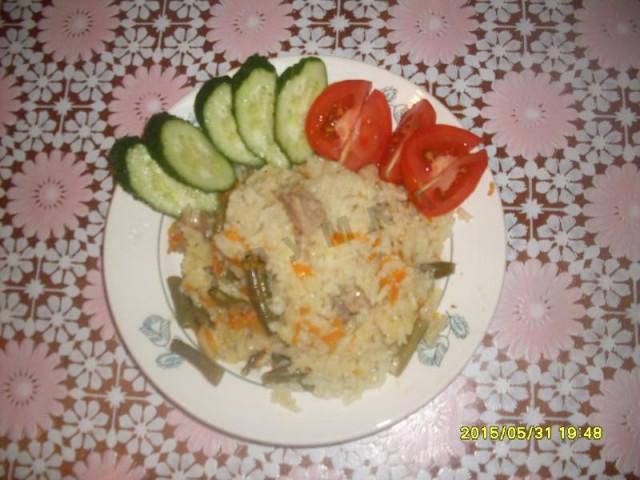 И стручковую фасоль. Обжариваем все вместе до окончания режима.