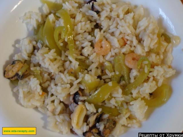Рис с морепродуктами, луком и перцем