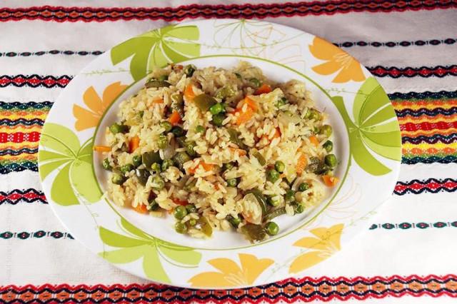 3. Добавляем к овощам зеленый горошек и поджариваем еще около 5 минут. Теперь кладем выбранные специи: соль, перец, кориандр, паприку, смесь сухих трав и щепотку шафрана.