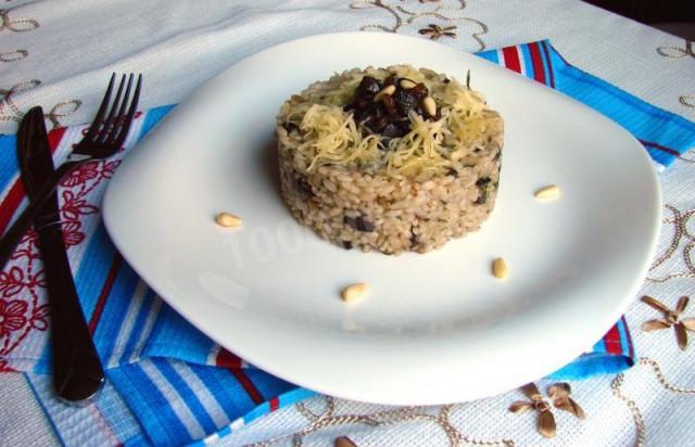 6. На тарелку поставить сервировочное кольцо в него выложить ризотто, аккуратно прижимая ложкой, снять кольцо. Наверх ризотто положить немного оставленных грибов и сыра. Все украсить кедровыми орешками.