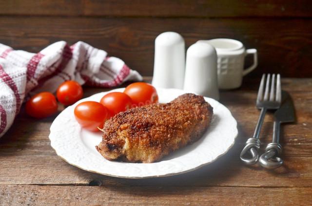 Затем обваляйте мясо в панировочных сухарях. Хорошо обваляйте, со всех сторон, чтобы получилась плотная хрустящая панировка.