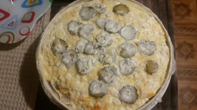 10. Выкладываем тонко нарезанные маринованные огурцы.