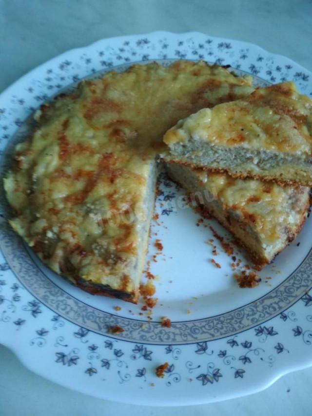 Тесто выкладываем в емкость для запекания тщательно разравнивая и подгоняя под вашу форму, потом выкладываем на него рыбный фарш, а сверху посыпаем тёртым сыром. Сыр подойдёт любой какой у вас есть. У меня обычный Сметанковый сыр который остался от праздничного стола и был натёрт мной на тёрку и благополучно заморожен для таких вот надобностей. Пирог запекаем в духовке при 180-200 градусов, примерно 30-40 минут. Это смотря на что способна ваша духовка)